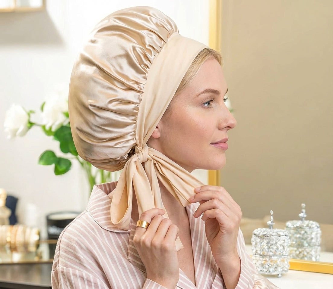 • Our 100% Mulberry silk bonnet creates a protective barrier that keeps your hair completely contained and friction-free throughout the night. Unlike cotton that causes breakage and frizz, silk allows hair to glide smoothly, preventing tangles, split ends, and moisture loss. Wake up with healthier, more manageable hair every morning.